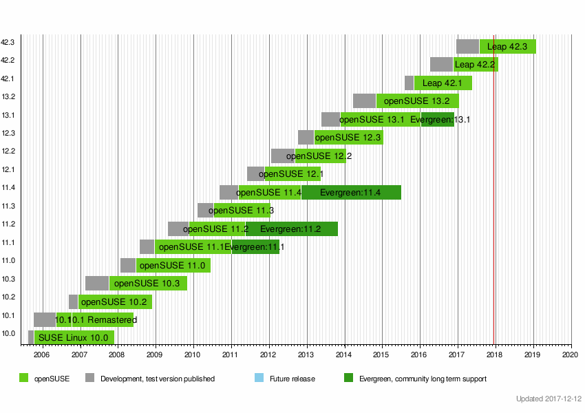 openSUSE发布的第一个版本是基于SuSE Professional 10.0的测试版,而目前的稳定版是在2017年7月26日发布的42.3,而42.x开始的版本是42.1 对上一个版本是2014年11月4日发布的13.2版。版本号为何跳跃如此之大,并选择这样的一个数字,可参看:《openSUSE Leap 42.1 华丽发布》一文。