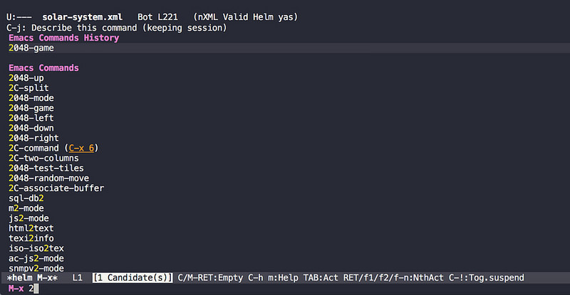 一些使用者喜欢它,但是其他人没有这么大的使用热情。我是后者的一部分。但在拥有这样一个庞大的追随者的情况下,是不能不提到它的。Helm 旨在完全变换你的 Emacs 使用体验。简单来说,Helm 是一个在 Emacs 中帮助你快速找到一个文件或命令的框架。根据你的输入,它将尝试使用词语自动完成来引导你将大脑的念头变为行动。起初感觉有点奇怪,但对一些人来说,Helm 本身就是一个信仰。虽然我不是 Helm 的粉丝,我欣赏 helm-occur 这一个伟大的工具可以在一个大文档搜索字符串并且在一个单独的缓冲区显示所有匹配结果,以便很容易在它们之间跳转。如果你正在寻找一个快速演示来了解 Helm 能做什么,我推荐这篇文章。