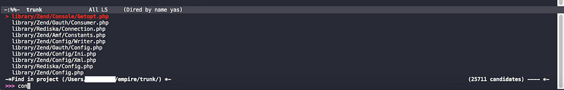 如果你喜欢 Sublime text 以及它可以用非常方便的Ctrl-p模糊搜索来打开一个项目中的任何文件的功能,你将会喜欢上 find-file-in-project (简称 ffip)的。使用设置指定了您的版本控制的根文件夹后,您可以轻松地调出一个很酷的文本条,通过快速扫描和搜索你的代码,来根据你输入的名称找到匹配的文件。我喜欢把它绑定到键盘上的 F6 键。如果你不知道整个目录从上到下的复杂结构,这很简单,而且非常易用。