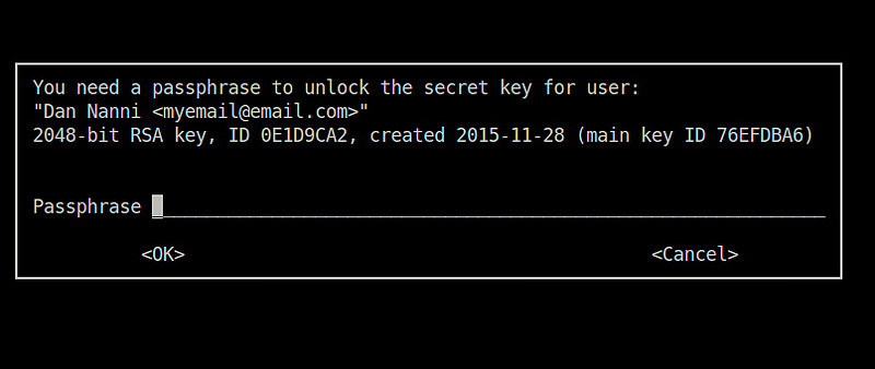 选择密钥类型(RSA),密钥长度(2048 bits),和过期时间(0 代表不过期)。当出现用户 ID 提示时,输入关联到该公钥/私钥对的名字(Dan Nanni) 和邮箱地址(myemail@email.com)。最后,输入一个密码来保护你的私钥。