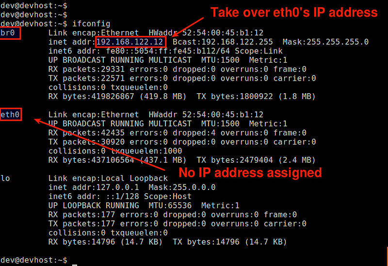重启网络服务,并确认网桥已经被成功的配置好。如果成功的话,br0 的 ip 地址将会是 eth0 自动分配的 ip 地址,而且 eth0 不会被分配任何 ip 地址。
