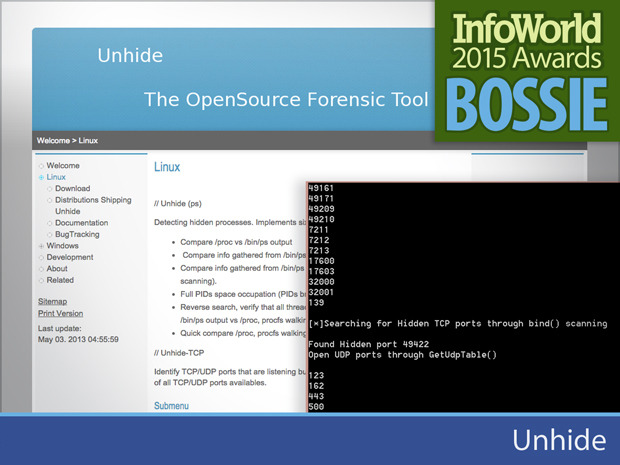 Unhide 是一个用于定位开放的 TCP/UDP 端口和隐藏在 UNIX、Linux 和 Windows 上的进程的审查工具。隐藏的端口和进程可能是由于运行 Rootkit 或 LKM( 可加载的内核模块 ( loadable kernel module ) ) 导致的。Rootkit 可能很难找到并移除,因为它们就是专门针对隐蔽性而设计的,可以在操作系统和用户前隐藏自己。一个 Rootkit 可以使用 LKM 隐藏其进程或冒充其他进程,让它在机器上运行很长一段时间而不被发现。而 Unhide 则可以使管理员们确信他们的系统是干净的。