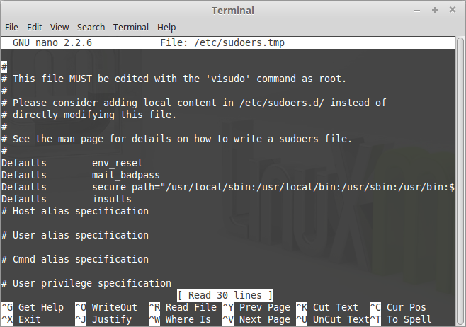 /etc/sudoers文件,但是 Ubuntu 及基于它的发行版会使用 nano 打开。由于我们在讨论vi,这里有一份 vi 速查表可以在你决定使用 vi 的时候使用。