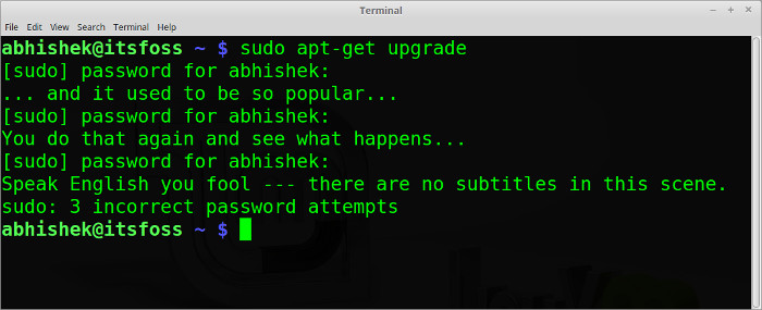 一旦你保存了 sudoers 文件之后,打开终端并使用 sudo 运行各种命令。故意输错密码并享受嘲讽吧:)