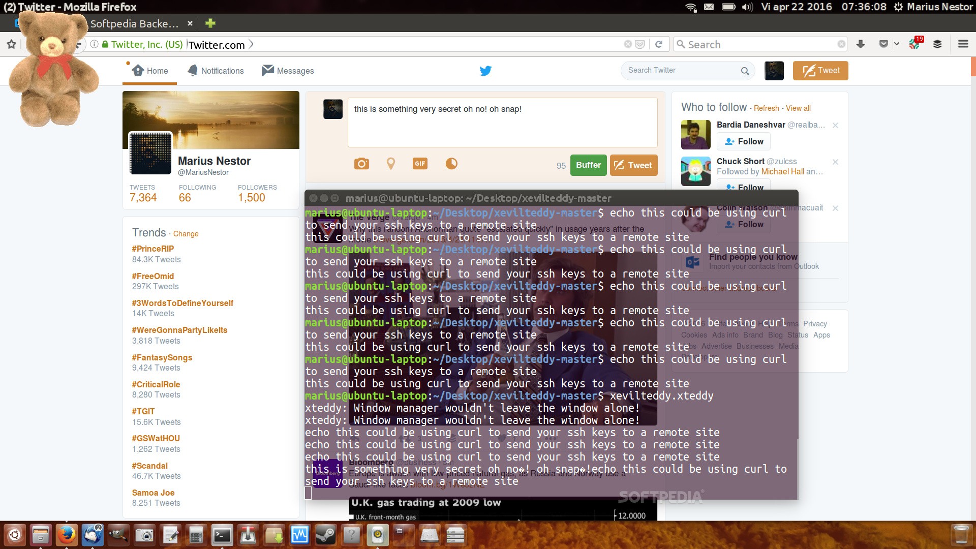 我们按照 Mr. Garrett 的指导,在一个最新更新的 Ubuntu 16.04 LTS 的机器上使用 Snapcraft 创建了 xevilteddy 的 snap 包。成功的创建了 snap 并安装之后,我们确认,当你看到如下的截屏时,这表明 xevilteddy 应用可以偷取你在另外一个 X11 应用中输入的任何内容,也能够使用 curl 将你的 SSH 密钥发送到远程的站点去。