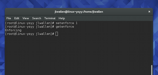 默认情况下,大部分系统的 SELinux 设置为 Enforcing。你要如何知道你的系统当前是什么模式?你可以使用一条简单的命令来查看,这条命令就是 getenforce。这个命令用起来难以置信的简单(因为它仅仅用来报告 SELinux 的模式)。要使用这个工具,打开一个终端窗口并执行 getenforce 命令。命令会返回 Enforcing、Permissive,或者 Disabled(见上方图 1)。