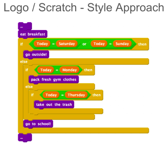 在现实生活中,计算机编程通常需要考虑各种类型的输入,并且同时还要动态处理各种逻辑判断。让我们举一个判断起床后要做什么的简单例子:如果是周六日,我们会去外面玩;如果是周一,我们需要穿上运动服;如果是周四,我们需要倒垃圾;而不是周末的日子,我们需要去上学。下面展示了用 Scratch 实现的逻辑。