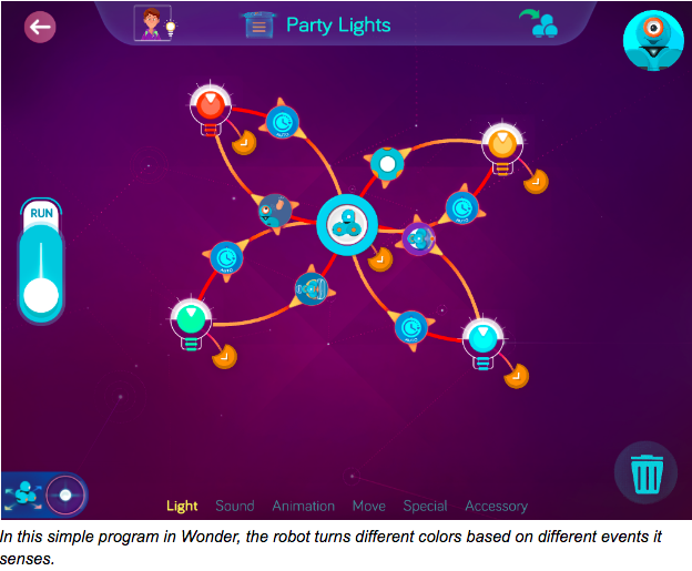 除了这些基于模块的编程语言,还有一种新的语言采用了不同的方式来教孩子们编程。2015年,Wonder Workshop 设计一个名为 Wonder 的新编程语言,采用的是基于流的编程界面。Wonder 可以让学生们将注意力放在一些预先定义好的功能单元(或语句)的连接上,来构建一个 状态机 ( state machine ) 。在任何时刻,机器人都是一个单一的给定状态;它会做一些操作,给一些输入就会让它改为做不同的操作。