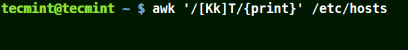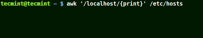 在下面的示例中,指定了模式 localhost,因此 awk 将匹配文件 /etc/hosts 中有 localhost 的那些行。