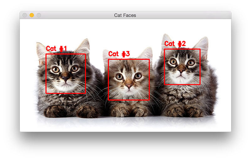 注意,Haar cascade 返回的检定框不一定是以你预期的顺序。这种情况下,中间的那只猫会被标记成第三只。你可以通过判断他们的 (x, y) 坐标来自己排序这些检定框。