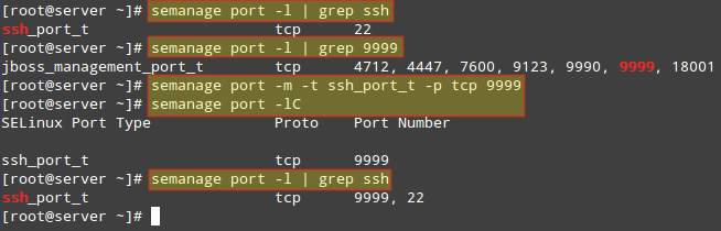 # semanage port -m -t ssh_port_t -p tcp 9999