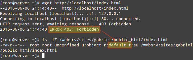 Apache 会拒绝提供内容,因为 index.html 已经被标记为了 default_t SELinux 类型,Apache 无法访问它: