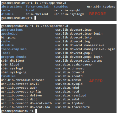 AppArmor 配置保存在 /etc/apparmor.d 中。让我们来看看这个文件夹在安装 apparmor-profiles 之前和之后有什么不同: