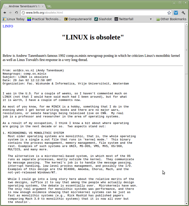 Andrew Tannenbaum 是一位操作系统专家,也是当时著名的 Minix 操作系统的作者,这是一个用于教学用途的 Unix 版本。Andrew 声称 “LINUX 是过时的”,从而打响了 Linux 的第一次操作系统之战。在由此而来的论战中,Linus 发表了一个至今看起来仍然正确的观点,“如果 GNU 内核(指 Hurd,这是另外一个尝试建立自由的类 Unix 操作系统的项目)去年春天就已经好了的话,我绝不会启动我的项目:事实上它根本没有完成,估计永远也完成不了。Linux 能胜出的很大原因就在于它现在就能用!”
