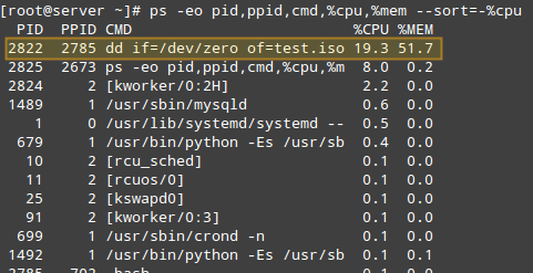 上面的命令只会显示 PID、PPID、和进程相关的命令、 CPU 使用率以及 RAM 使用率,并按照 CPU 使用率降序排序。创建 .iso 文件的时候运行上面的命令,下面是输出的前面几行: