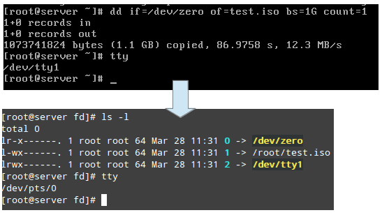 上面的截图显示 stdin(文件描述符 0)、stdout(文件描述符 1)、stderr(文件描述符 2) 相应地被映射到 /dev/zero、 /root/test.iso 和 /dev/tty1。
