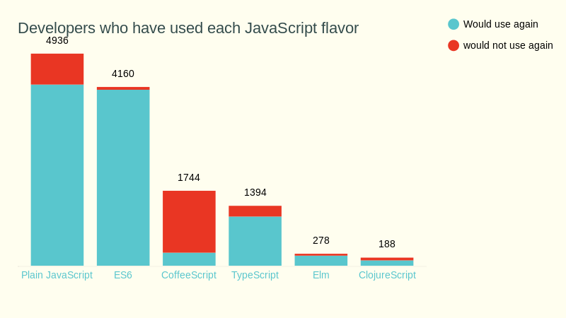 几乎所有人都知道 ES6、CoffeeScript 和 TypeScript 这三种语言,比较令我惊讶的是 TypeScript 竟然会稍微落后于 ES6 和 CoffeeScript。