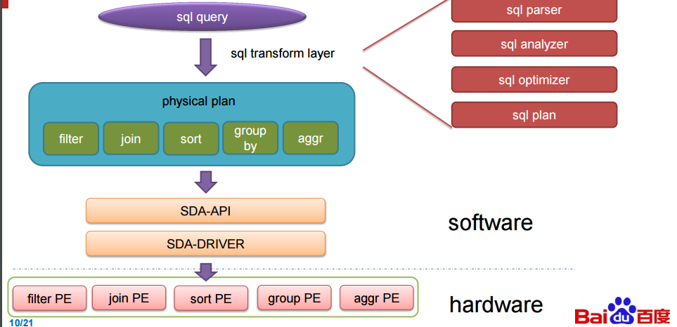 为了实现 SQL 查询加速,百度针对 TPC-DS 的基准测试进行了研究,并且创建了称做处理单元(PE)的特殊引擎,用于在基准测试中加速 5 个关键功能,这包括 筛选 ( filter ) , 排序 ( sort ) , 聚合 ( aggregate ) , 联合 ( join ) 和 分组 ( group by ) ,(我们并没有把这些单词都像 SQL 那样大写)。SDA 设备使用卸载模型,具有多个不同种类的处理单元的加速卡在 FPGA 中组成逻辑,SQL 功能的类型和每张卡的数量由特定的工作量决定。由于这些查询在百度的系统中执行,用来查询的数据被以列格式推送到加速卡中(这会使得查询非常快速),而且通过一个统一的 SDA API 和驱动程序,SQL 查询工作被分发到正确的处理单元而且 SQL 操作实现了加速。