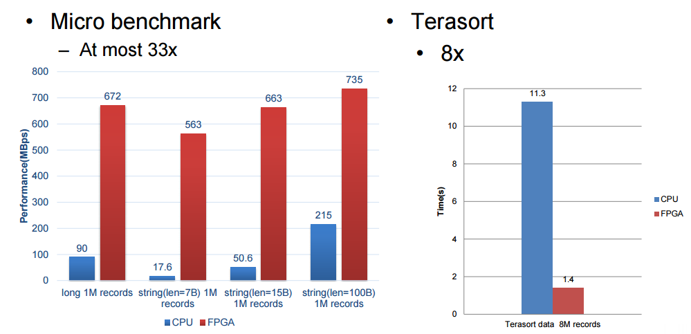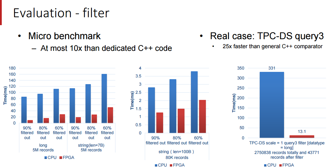 欧阳提到了一件事,他们的加速器受限于 FPGA 的带宽,不然性能表现本可以更高,在下面的评价中,百度安装了 2 块12 核心,主频 2.0 GHz 的 intl E26230 CPU,运行在 128G 内存。SDA 具有 5 个处理单元,(上图中的 300MHz FPGA 主板)每个分别处理不同的核心功能( 筛选 ( filter ) , 排序 ( sort ) , 聚合 ( aggregate ) , 联合 ( join ) 和 分组 ( group by ) )