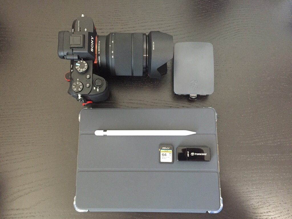 相机的 SD 卡通过 SD 读卡器插到树莓派 USB 端口之一,128G 的大容量优盘一直插在树莓派的另外一个 USB 端口上,我选择了一款闪迪的,因为体积比较小。主要的思路就是通过 Python 脚本把 SD 卡的照片备份到优盘上,备份过程是增量备份,每次脚本运行时都只有变化的(比如新拍摄的照片)部分会添加到备份文件夹中,所以这个过程特别快。如果你有很多的照片或者拍摄了很多 RAW 格式的照片,在就是个巨大的优势。iPad 将用来运行 Python 脚本,而且用来浏览 SD 卡和优盘的文件。