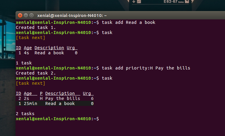 我使用上面截图中的同样一个例子。是的,你可以设置优先级(H、L 或者 M)。并且你可以使用‘task’或者‘task next’命令来查看你最新创建的 to-do 列表。比如: