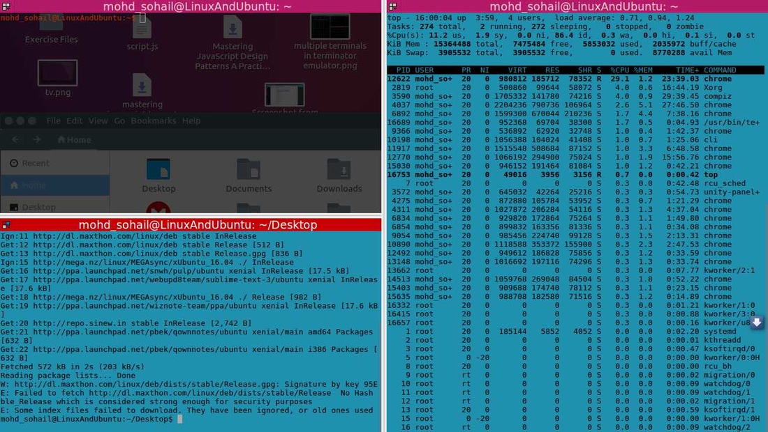 安装好 Terminator 之后,你可以简单的在一个窗口打开多个终端。只需要右键点击并切分。