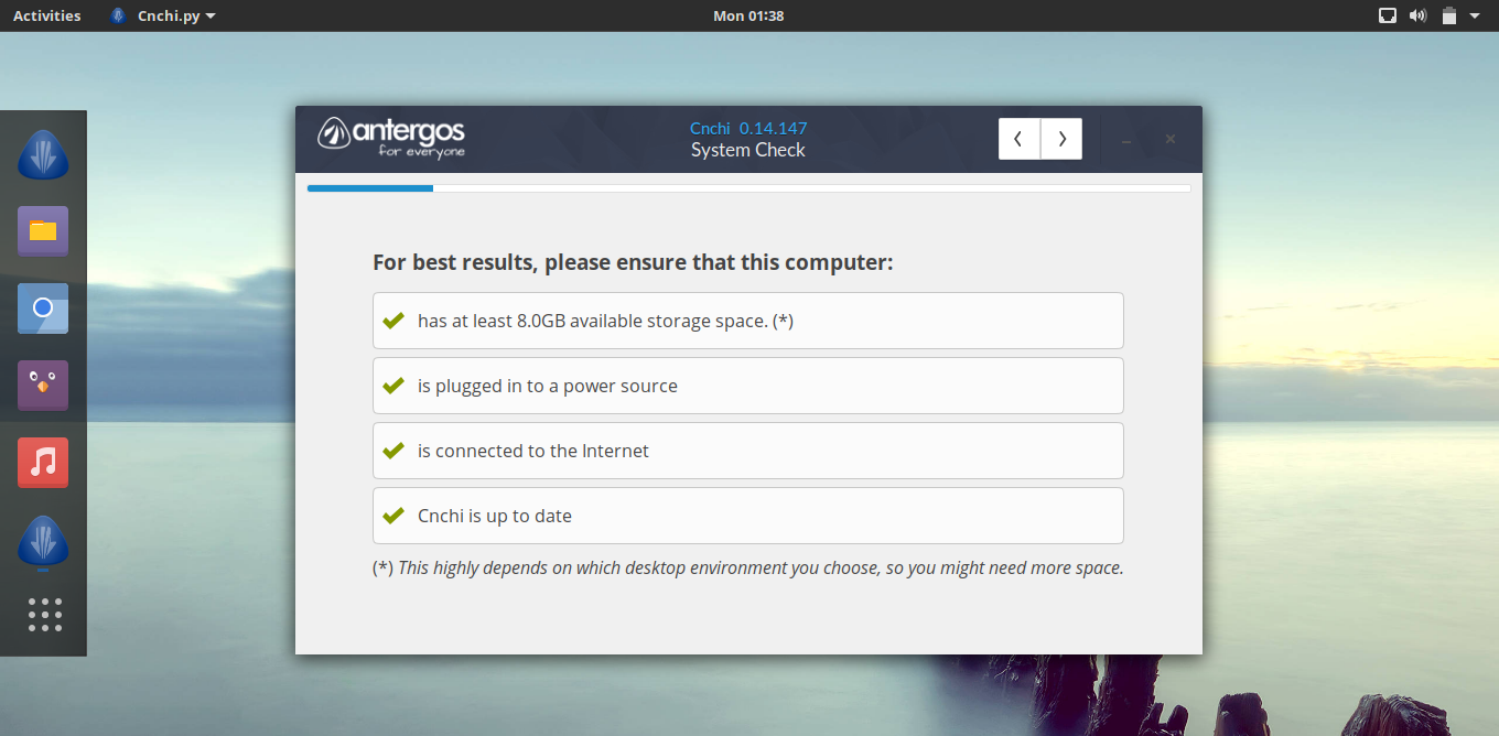 请确保你有足够的磁盘空间,连接好电源以及连接到网络,点击 Next 按钮继续下一步。