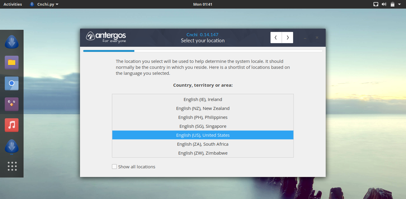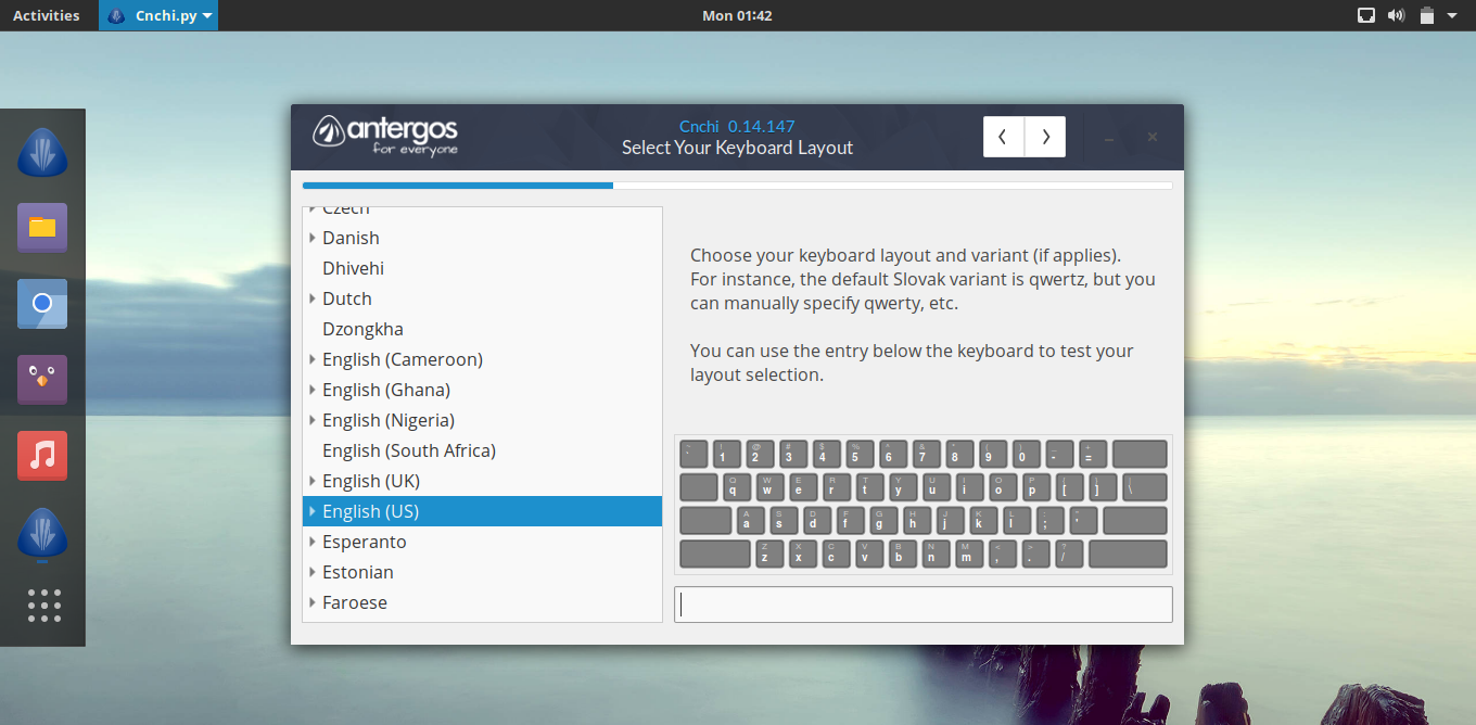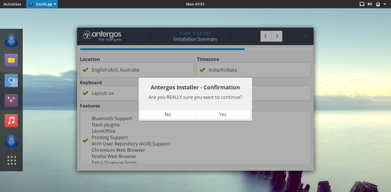 Antergos 有多个语言版本,包括英语、西班牙语等版本,在安装时你可以在语言栏选择预置语言。默认的配置确保了开箱即用,不需要安装额外的软件就可以直接浏览网页、听音乐、看视频以及做任何你想做的事情。