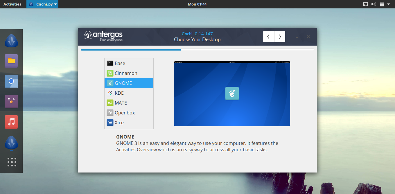 Antergos 提供了多个选择(包括 Cinnamon、Gnome、KDE、MATE、Openbox 和 Xfce),根据你的喜好进行选择即可。然后点击 Next 按钮继续下一步。