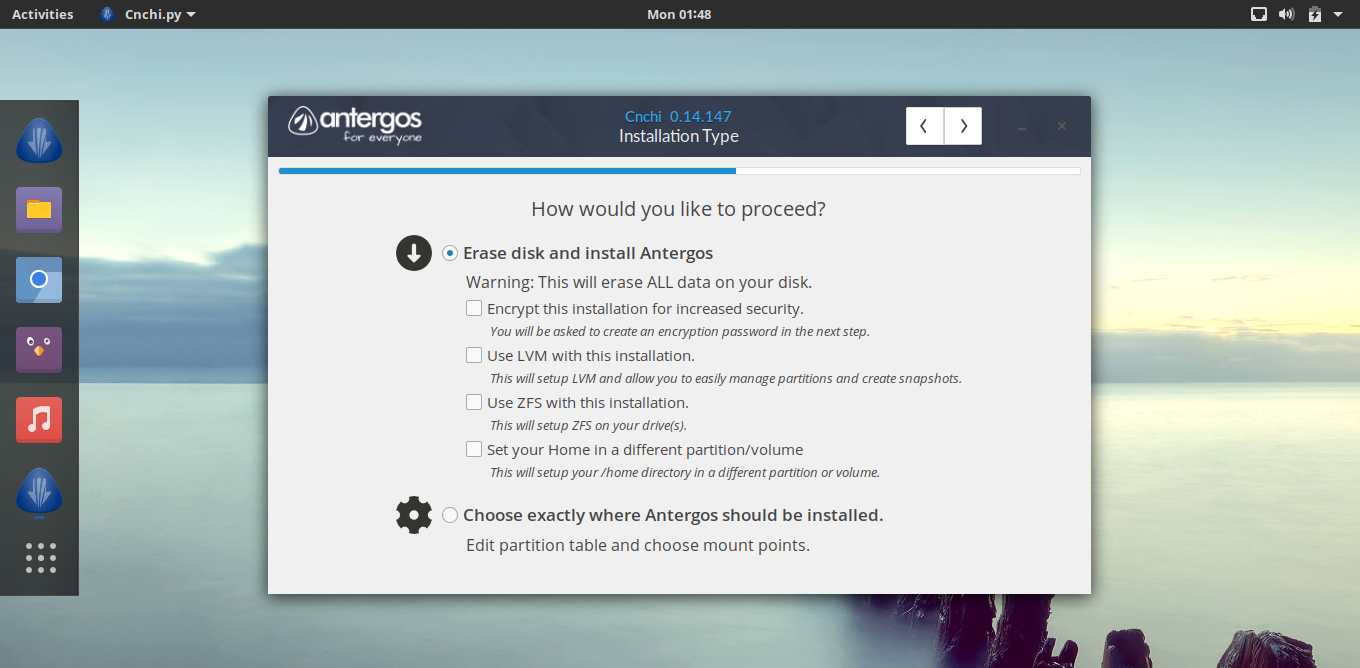 初次安装可以选择第一个选项( Erase disk and install Antergos )。然后点击 Next 按钮继续下一步。(LCTT 译注,但是要注意这个选项会擦除你的整个硬盘数据,如果你是全新安装,则可以使用该选项。)