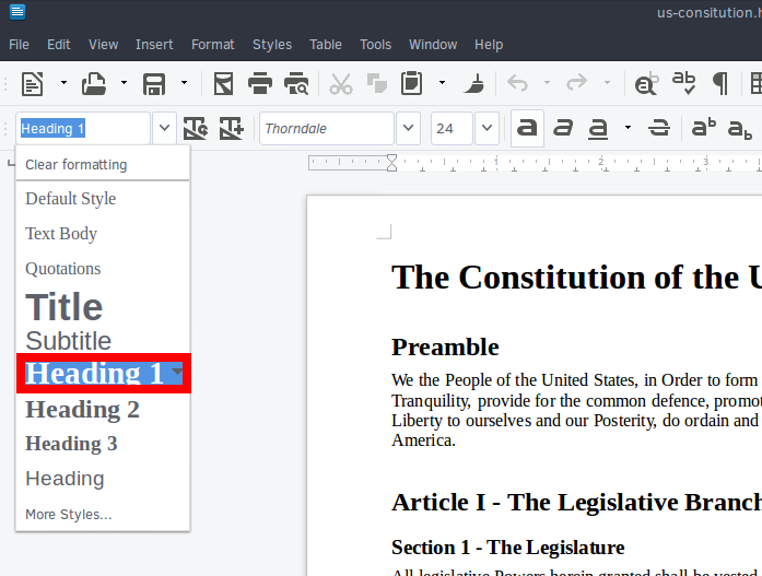 首先,你需要用你的文本处理器程序打开你的原稿。 Calibre 可以自动的为你创建一个书籍目录。要使用到这个功能,你需要在你的原稿中设置每一章的标题样式为 “Heading 1”,在 LibreOffice 中要做到这个只需要高亮标题并且在段落样式下拉框中选择“Heading 1”即可。