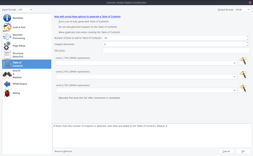 接下来,我们会创建一个内容目录。如果不打算在你的书中使用目录,你可以跳过这个步骤。选中“ 内容目录 ( Table of Contents ) ” 标签。接下来,点击“ 一级目录 ( Level 1 TOC (XPath expression) ) ”右边的魔术棒图标。