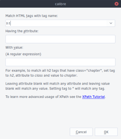 在这个新的窗口中,在“ 匹配 HTML 标签 ( Match HTML tags with tag name ) ”下的下拉菜单中选择“h1”。点击“OK” 来关闭这个窗口。如果你有子章节,在“ 二级目录 ( (Level 2 TOC XPath expression) ) ”下选择“h2”。
