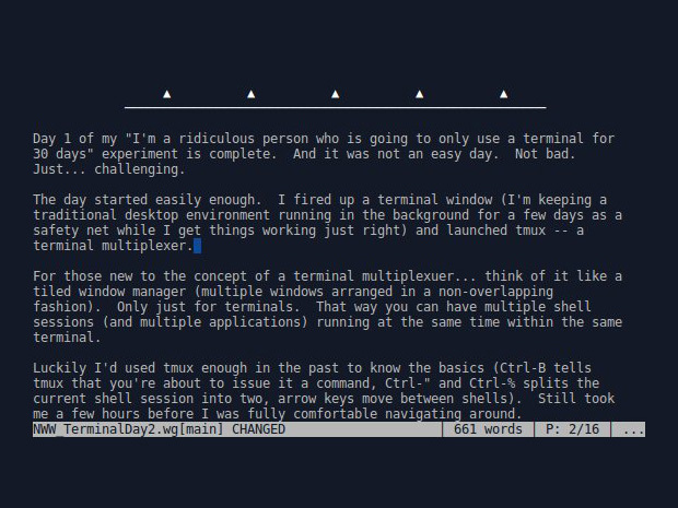 在一个只有文本的 shell 之中,“文本编辑器” 和 “文字处理程序” 实在没有什么大的区别。但是像我这样需要大量写作的,有一个专门用于长期写作的软件是非常必要的。而我最爱的就是 wordgrinder。它由足够的工具让我愉快工作——一个菜单驱动的界面(使用快捷键控制)并且支持 OpenDocument、HTML 或其他等多种文件格式。