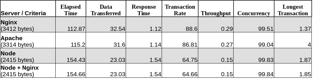 还有一个相当惊人的事实是,在特定的用户并发数和请求数下,Node.js 可以比 Nginx 和 Apache 更快。