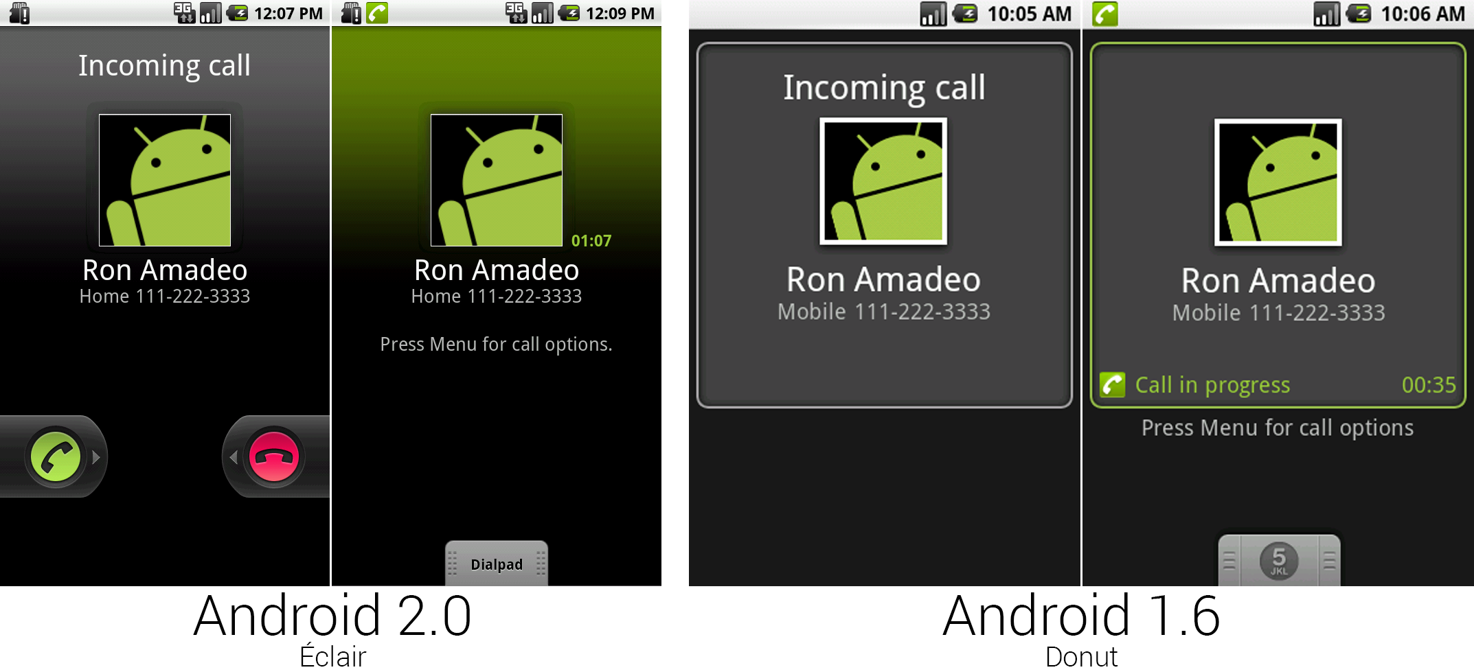 安卓 2.0 终于配备了接通和拒绝来电所需要的所有屏幕按键,而不再需要实体按钮,Droid 从中获益,从它的设计中除去了在现在看来是多余的按钮。安卓对于接通和拒绝来电的解决方案是这些左滑和右滑的标签。他们的工作方式就像是滑动解锁(后来被用到了滑动解锁中)——向右滑动绿色按钮接通来电,向左滑动红色按钮则是拒绝。一旦进入通话中,它看起来就很像安卓 1.6 了。所有选项还是隐藏在菜单按钮之中。