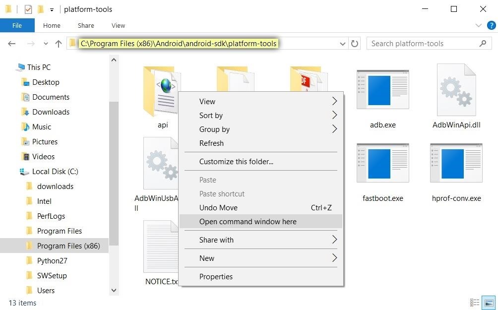 转到 ADB 和 Fastboot 的安装目录。对于 Windows 用户来说,这目录通常是 C:\Program Files (x86)\Android\android-sdk\platform-tools。 对于 Mac 和 Linux 用户,则取决于你安装此工具时将 ADB 解压的位置,所以如果你忘了位置的话,就在硬盘里搜索 platform-tools。