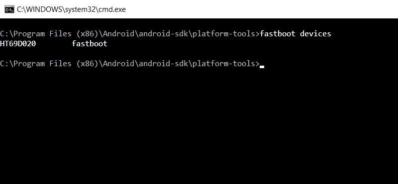 如果程序输出了以 fastboot 结尾的一串字符,那就说明你的设备连接正常,可以继续操作。如果没有的话,回到第一步,检查你的 ADB 以及 Fastooot,是否正确安装,之后再确定设备是否如第三步所示进入了 bootloader 模式。