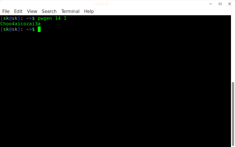 上面的命令将生成一个 14 位字符长的密码,如果要生成两个不同的 14 位字符长的密码,则可以运行: