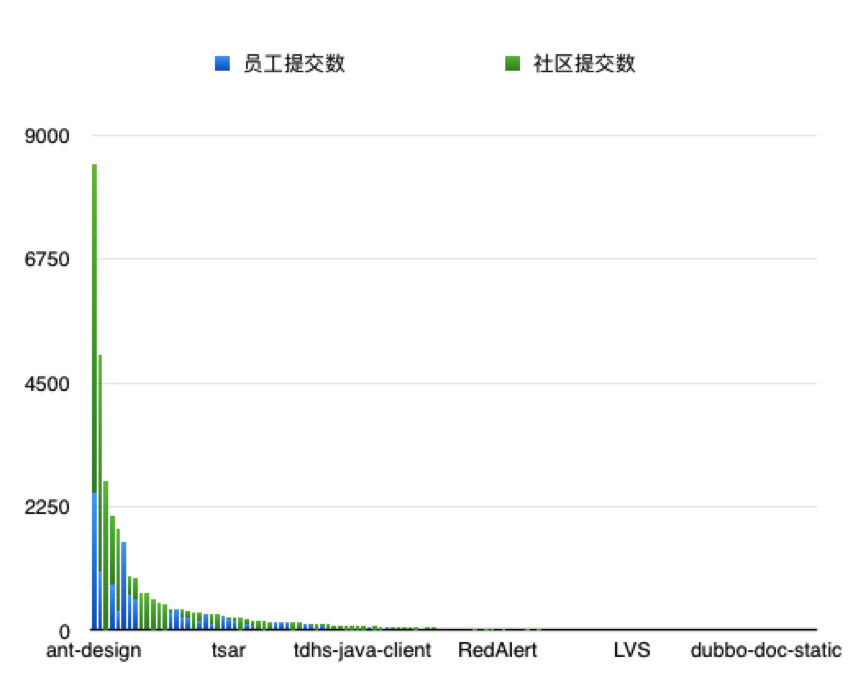 我们可从上表中看到,阿里旗下开源的项目提交数最多的是 ant-design 项目,这是蚂蚁金服旗下推出的一种 UI 设计语言,在开源两年来,得到了快速的发展。我们可以看到,其提交数约计比第二名高过 1/3,其中社区提交数是成员提交数的两倍,并且日均提交数也达到了很高的水平。