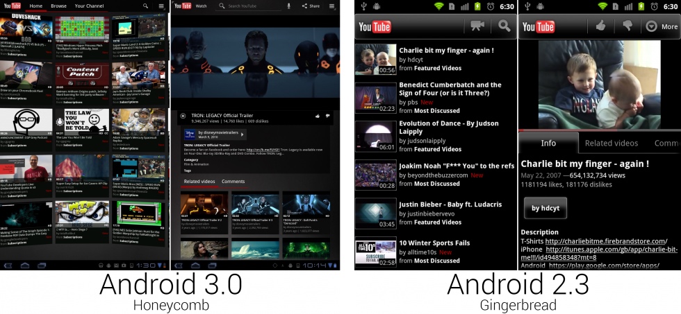 谢天谢地 Youtube 终于抛弃了自安卓 2.3 以来的谷歌给予这个视频服务的“独特”设计,新界面设计与系统更加一体化。主界面是一个水平滚动的曲面墙,上面显示着最热门或者(登录之后)个人关注的视频。虽然谷歌从来没有将这个设计带到手机上,但它可以被认为是一个易于重新配置的卡片界面。操作栏在这里是个可配置的工具栏。没有登录时,操作栏由一个搜索栏填满。当你登录后,搜索缩小为一个按钮,“首页”,“浏览”和“你的频道”标签将会显示出来。