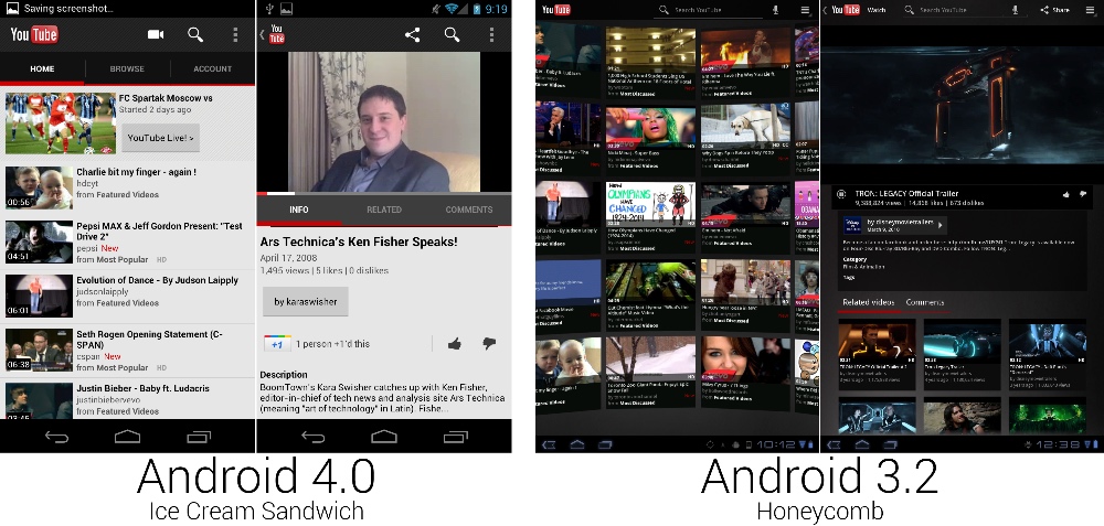 Youtube 几乎在所有地方都使用了滑动标签页。它们被放置在主页面以在浏览和账户间切换,放置在视频页面以在评论,介绍和相关视频之间切换。4.0 版本的应用显示出 Google+ Youtube 集成的第一个信号,通常的评分按钮旁边放置了 “+1” 图标。最终 Google+ 会完全占据 Youtube,将评论和作者页面变成 Google+ 活动。