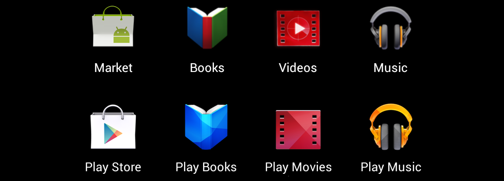 2012 年 3 月 6 日,谷歌将旗下提供的所有内容统一到 “Google Play”。安卓市场变为了 Google Play 商店,Google Books 变为 Google Play Books,Google Music 变为 Google Play Music,还有 Android Market Movies 变为 Google Play Movies & TV。尽管应用界面的变化不是很大,这四个内容应用都获得了新的名称和图标。在 Play 商店购买的内容会下载到对应的应用中,Play 商店和 Play 内容应用一道给用户提供了易管理的内容体验。