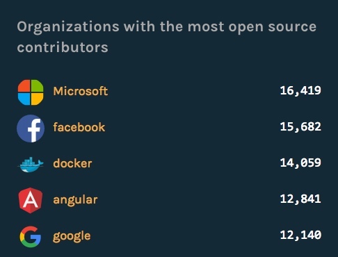 根据去年的章鱼猫报告,GitHub上开源贡献者最多的组织是微软,超过了 Facebook、docker,以及谷歌。