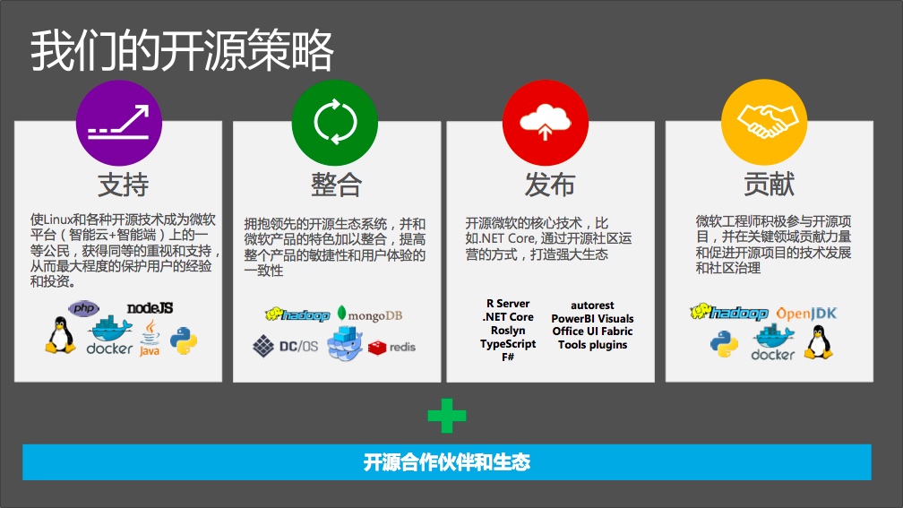 这充分证明了微软的开源策略的实行情况。据微软内部资料,其开源策略分为四个方面:支持、整合、发布和贡献。
