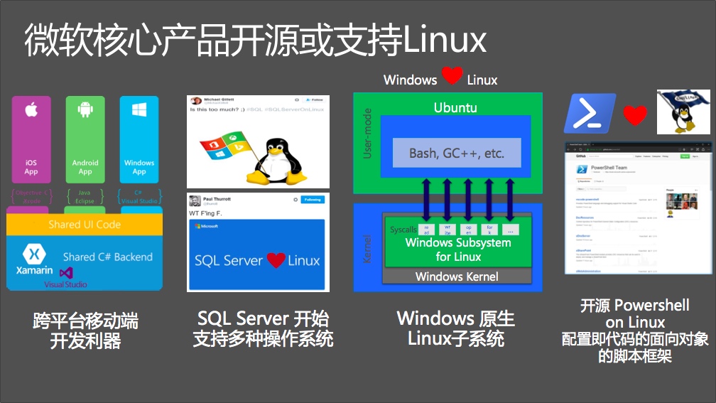 现在,微软逐渐加大了对开源和 Linux 方面的关注和投入,诸如 PowerShell、Visual Studio Code 以及 Edge JavaScript 引擎这样的项目,已经逐个开源化,将微软推近这个它曾经憎恨过的开源世界。而且,通过 Windows 10,微软开始走进 Linux,因为该操作系统内置了 Ubuntu。 在收购了 Xamarin 之后,还开源了其软件开发工具包。此外,微软还和 Red Hat 和 SUSE 合作在Azure 云上推出了有官方支持的 Linux 镜像。而今年初,微软还发布了 Linux 上的 SQL Server,甚至得到了鲍尔默的赞誉。