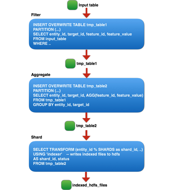 基于 Hive 的流水线由三个逻辑 阶段 ( stage ) 组成,每个阶段对应由 entity_id 划分的数百个较小的 Hive 作业,因为在每个阶段运行大型 Hive 作业 ( job ) 不太可靠,并受到每个作业的最大 任务 ( task ) 数量的限制。