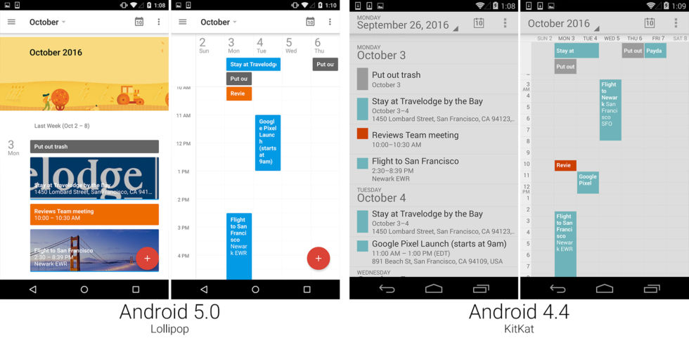 谷歌日历完全重写了,获得了很多新设计,也失去了很多特性。你不再能够双指缩放来调整时间视图,月份视图也从手机上消失了,周视图从七天退化成了五天的视图。在用户抱怨之后,谷歌将会花费接下来几个版本的时间来重新添加回这里面的一些特性。“谷歌日历”还加强了“谷歌”部分,去除了直接在应用内添加第三方账户的能力。非谷歌账户现在需要从 Gamil 来添加。