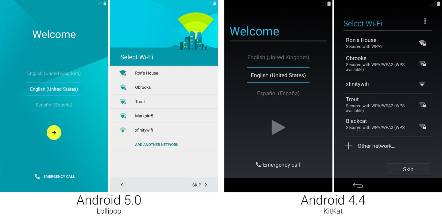 在棒棒糖中,开机设置工作的前几个界面和之前的很像。你可以看到“欢迎使用安卓界面”以及一些设置数据和 Wi-Fi 连接的选项。但在这个界面之后就有了变化。一旦棒棒糖连接到了互联网,它会连接到谷歌的服务器来“检查更新”。这并不是检查系统或应用的更新,是在检查即将执行的设置工作的更新。安卓下载了最新版本的设置,然后它会要求你登录你的谷歌账户。