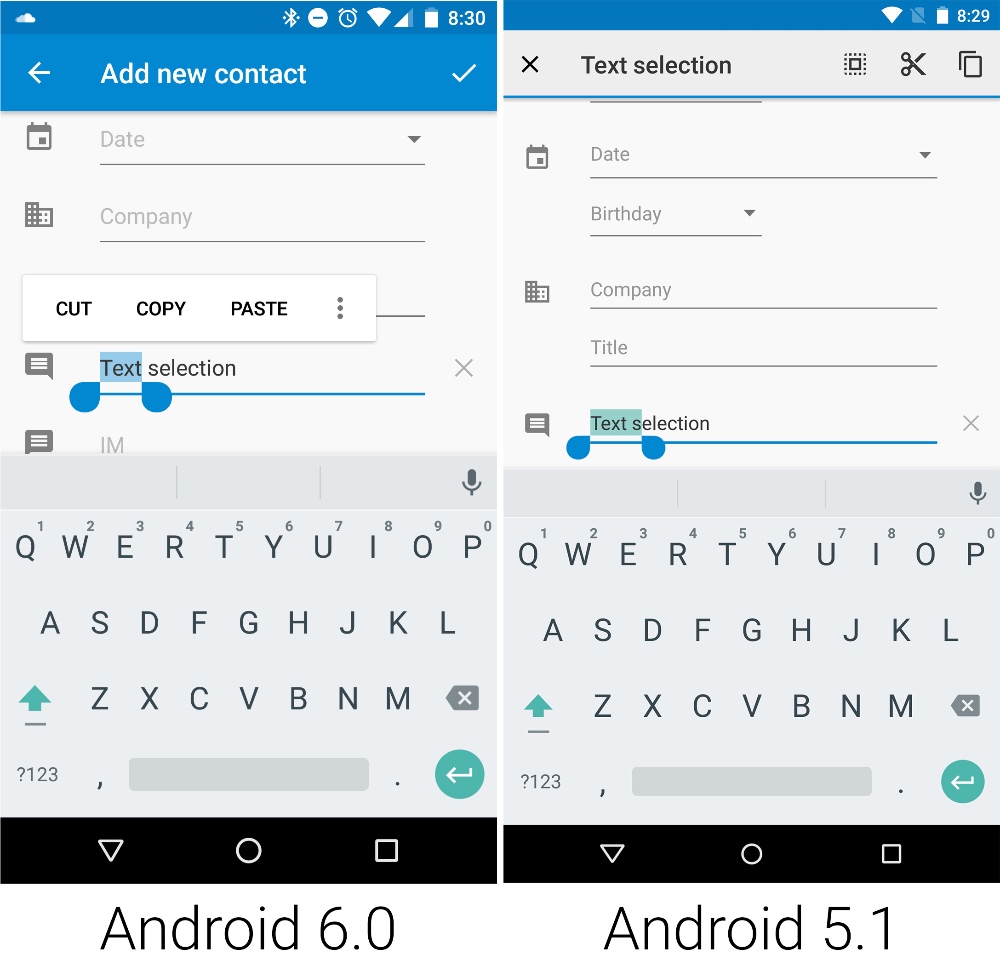 文本选择菜单现在是个浮动工具条,会在你选择的时候在文本旁边弹出。这里也不止是常规的“剪切/复制/粘贴”命令。应用可以在工具栏上放置特殊选项,比如谷歌文档里的“添加链接”。